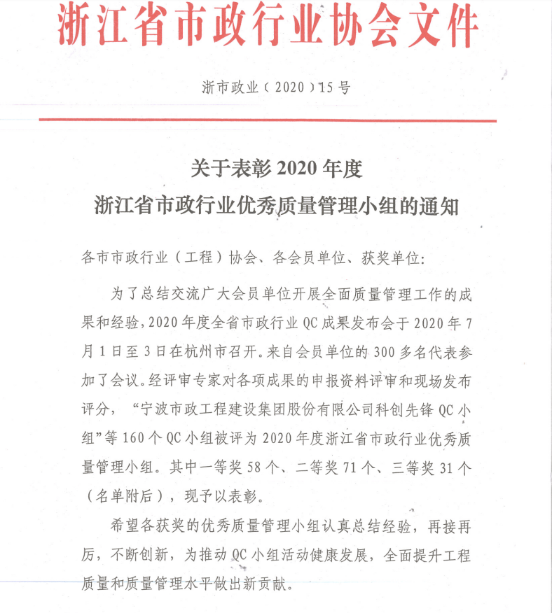 2020浙江省市政優秀qc二等獎