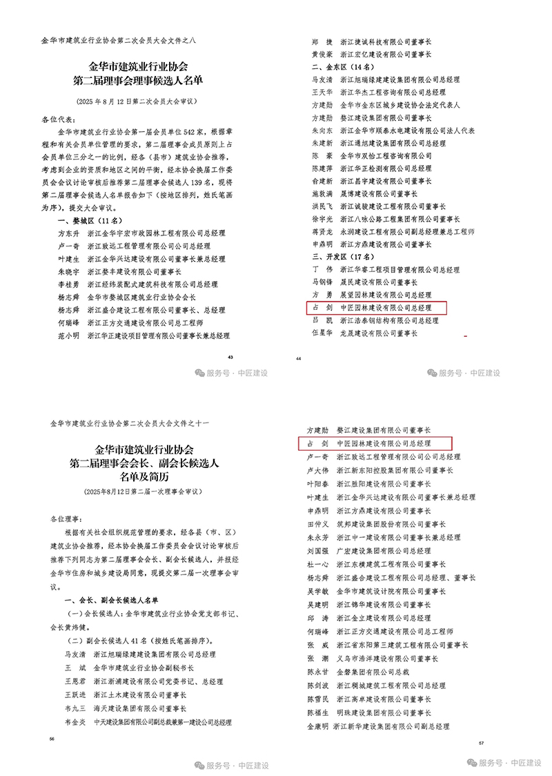 中匠建設也將以此次占劍總經理當選為契機,進一步加強與行業協會和其他企業的合作,不斷提升自身實力和競爭力。公司將繼續秉持“品質至上、創新發展”的經營理念,以更加飽滿的熱情和更加嚴謹的態度,投身于金華市的城市建設中,為打造更多優質工程、推動城市發展做出更大貢獻。
